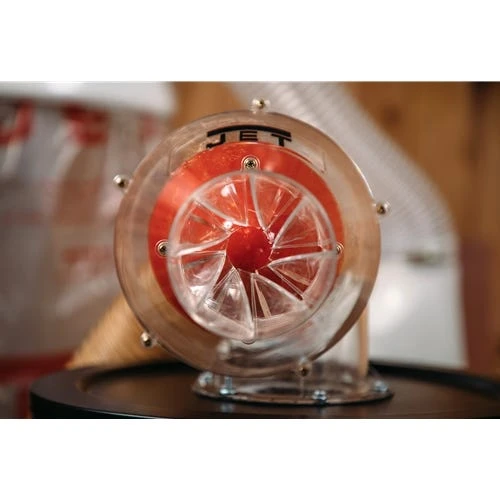 The JET Cyclonic Separator maximizes dust collection efficiencyby maintaining the air flow of a dust collection system by deflectingchips and large debris; freeing up dust collection filters to trap fineparticles. The red bullet separator deflects chips downward into abin; reducing damage and obstruction to the dust collection hoses;impellors and filters. The JET Cyclonic Separator can be purchasedwith a 30 gallon locking steel bin than moves around the shop on 4casters and includes a viewing window to view chip capacity. TheJET Cyclonic Separator by its self can also be placed on the lid ofalmost any size container.