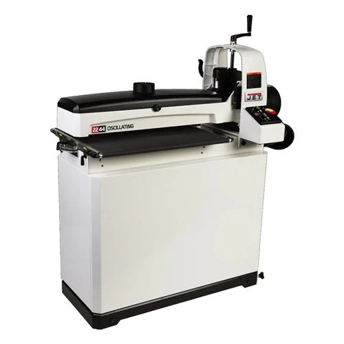 The 2244 Oscillating Drum Sander from JET has an exclusive oscillating feature that helps create the best sanding finish with the least amount of dust. When in the oscillating mode; the sanding drum head oscillates from left to right which lowers heat build-up on the sanding belt; reducing loading and burning. The innovative tool-less parallelism system keeps adjustments simple. The worktable is easily positioned by a turn of the parallelism dial. The Sandsmart™ conveyer system continuously monitors the load on the drum motor to prevent an overload situation. The mirrored design of the dust hood optimizes dust collection preventing chips and dust from getting between your work-piece and the finish. The JET 2244 Oscillating Drum Sander delivers everything you need for an effortless finish.
