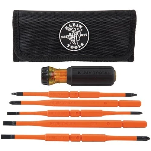 Klein Tools’ Interchangeable Insulated Screwdriver Set includes an insulated handle and 5 interchangeable insulated blades for quick changes on the job. The auto-eject mechanism works with just a twist; allowing you to change or flip blades simply and easily. A bright orange coating of insulation protects from electrical shock; as well as being flame and impact resistant.